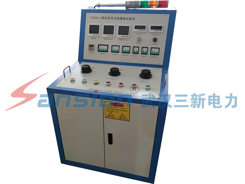 SXGK-II型高低压开关柜通电试验台用于高低压开关柜生产厂家对所生产的高低压开关柜进行出厂前的各项通电试验。它能提供各种交、直流电源,便于对开关柜的检测,提高工作效率。本仪器采用数显式表头可直接显示直流电压、交流电压、交流电流.的测试值,便于试验观察及记录,具有较高的测量精度,测试值准确。