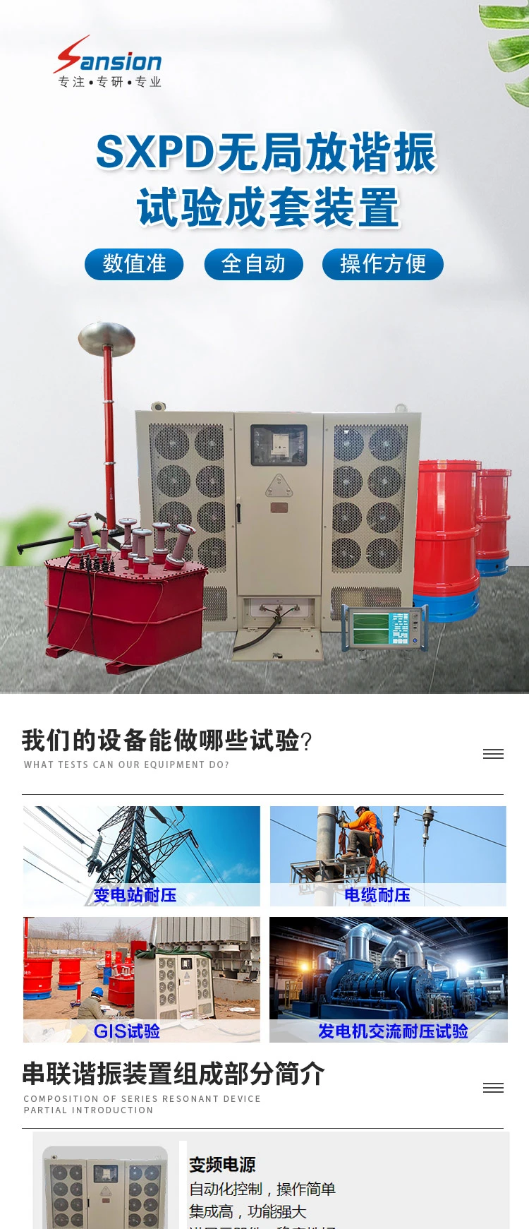 SXPD系列无局放串联谐振耐压装置满足220KV及以下电压等级电力变压器的局部放电和感应耐压试验!1000KV及以下电压等级GIS、断路器、绝缘子、套管、电压互感器、电流互感器电缆等电力设备的交流耐压和局部放电试验!