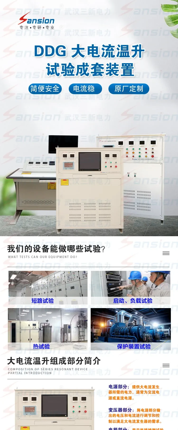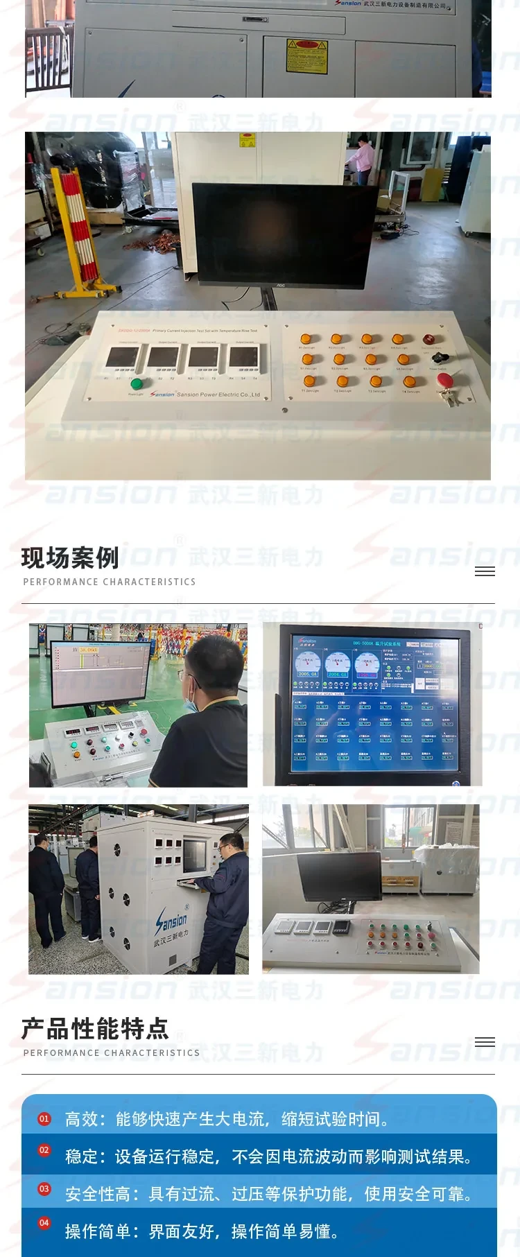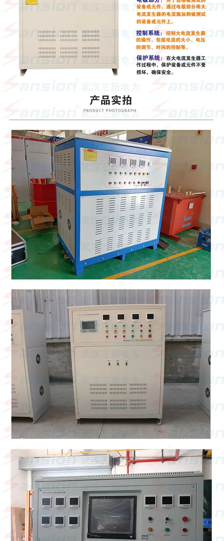 SXWA系列三相电流温升试验装置采用进口高导磁材料、设计精巧、具有体积小、耐电动力强、方便使用的特点该系列大电流发生器是各行各业在电气调试中需要大电流场所的必需设备,应用于发电厂、变配电站、电器制造厂及科研、试验室等单位,属于短时或断续工作制,它具有体积小、重量轻、性能好,等特点。适用于频率50Hz开关、电流互感器和其它电器设备的电流负载试验及升温试验。该系列产品由操作台及升流器两部分构成,具有输出电流无极调整、电流上升平稳、负荷变化范围大、工作可靠、操作简便安全等特点,也可作为工矿企业进行升流或温升试验的电流源设备。配有互感器,能方便地读取试验电流值。